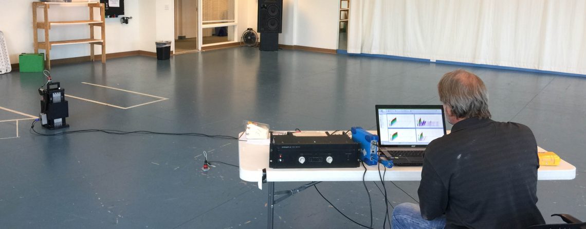 During shaking, a sensitive accelerometer is placed on the floor and a data collector measures the response at different frequencies. It is that simple. Learn more about this technology at APS Dynamics.